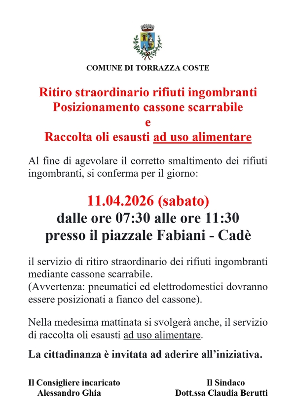 Al fine di agevolare il corretto smaltimento dei rifiuti ingombranti, si conferma per il giorno: 11.04.2026 (sabato)