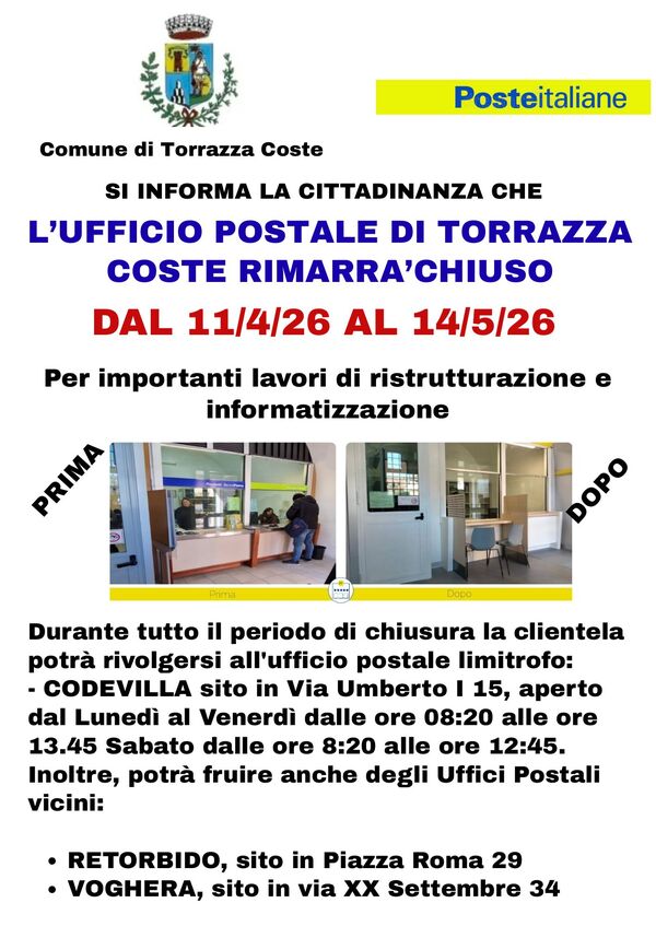 Si informa la cittadinanza che l'Ufficio postale di Torrazza Coste RIMARRA' CHIUSO dal 11/04/2026 AL 14/05/2026 per importanti lavori di ristrutturazione e informatizzazione.