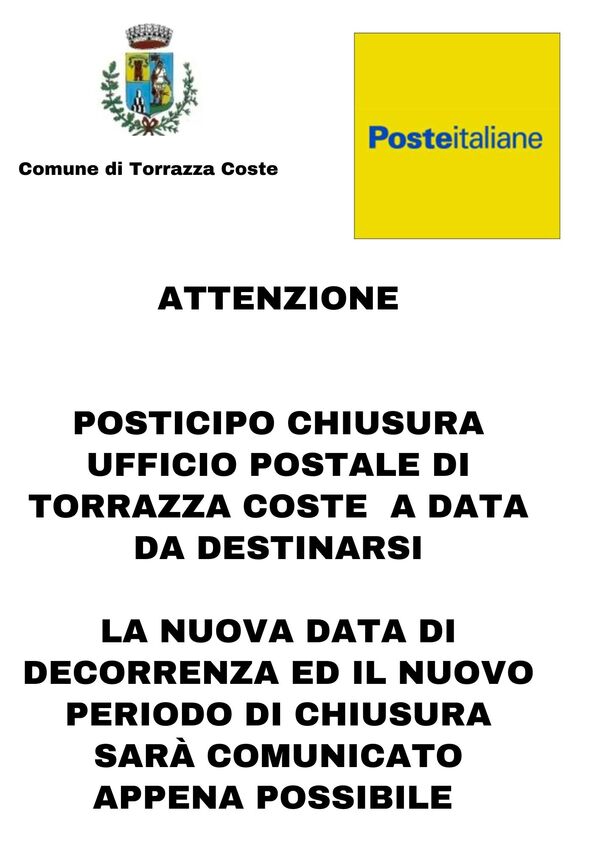 Si avvisa la cittadinanza che la chiusura dell'Ufficio postale di Torrazza Coste, è stata posticipata a data da destinarsi.