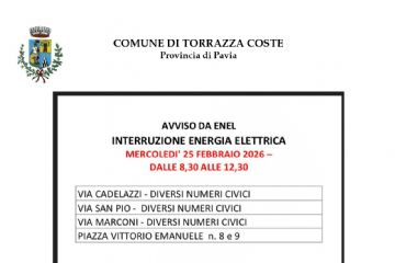 Si avvisa la cittadinanza che il giorno MERCOLEDI' 25 FEBBRAIO 2026 dalle ore 8:30 alle ore 12:30, verrà interrotta l'energia elettrica per...